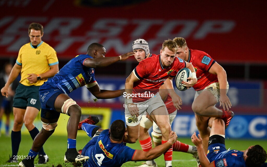 2 October 2021; Mike Haley of Munster in action against Adre Smith, 4, and Nama Xaba of DHL Stormers during the United Rugby Championship match between Munster and DHL Stormers at Thomond Park in Limerick. Photo by Sam Barnes/Sportsfile