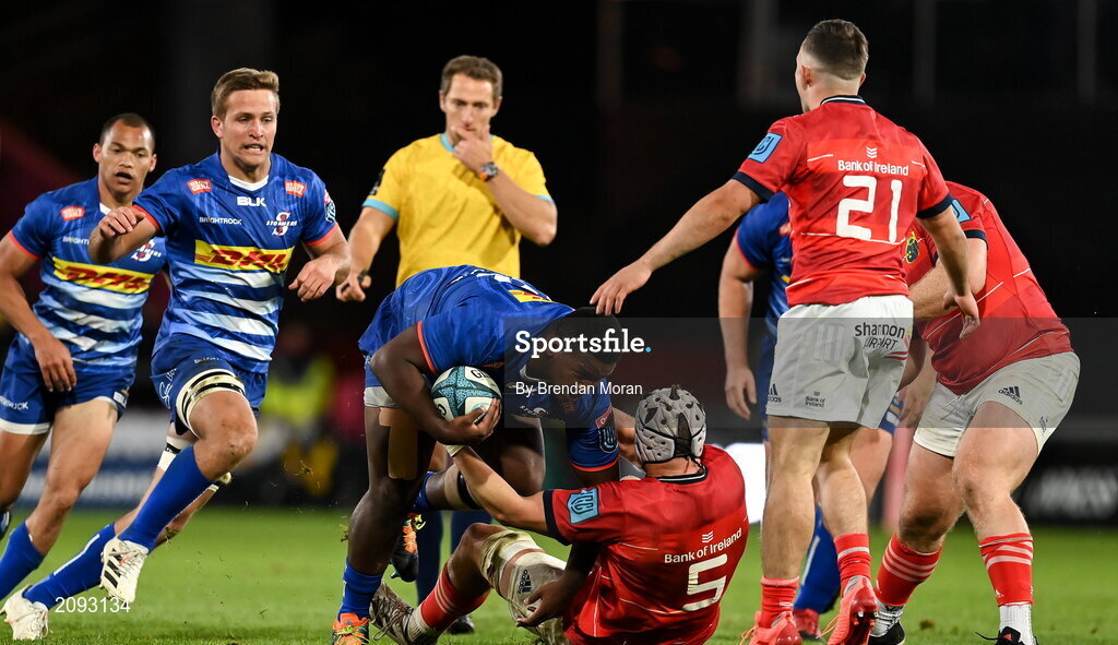 2 October 2021; Sazi Sandi of DHL Stormers is tackled by Fineen Wycherley of Munster during the United Rugby Championship match between Munster and DHL Stormers at Thomond Park in Limerick. Photo by Brendan Moran/Sportsfile