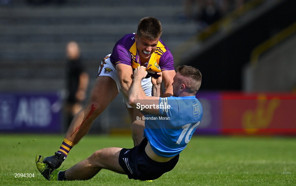 4 July 2021; Eoin Porter of Wexford and Paddy Small of Dublin tussle during the Leinster GAA Football Senior Championship Quarter-Final match between Wexford and Dublin at Chadwicks Wexford Park in Wexford. Photo by Brendan Moran/Sportsfile
