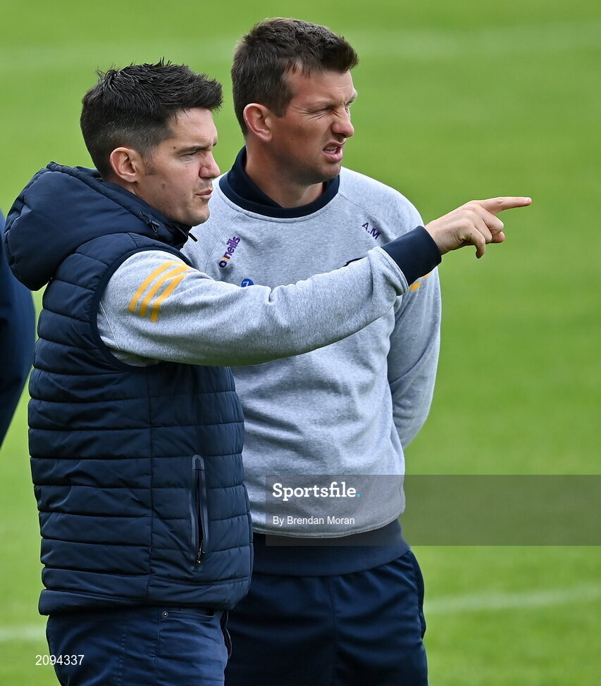 4 July 2021; Wexford manager Shane Roche, left, and selector Anthony Masterson before the Leinster GAA Football Senior Championship Quarter-Final match between Wexford and Dublin at Chadwicks Wexford Park in Wexford. Photo by Brendan Moran/Sportsfile