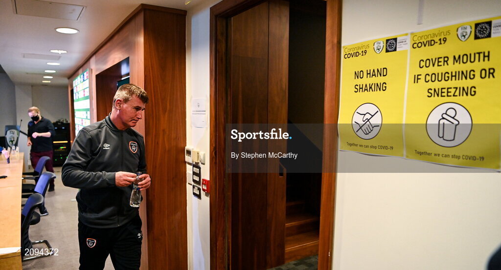 5 October 2021; Manager Stephen Kenny leaves a Republic of Ireland press conference at FAI Headquarters in Abbotstown in Dublin. Photo by Stephen McCarthy/Sportsfile