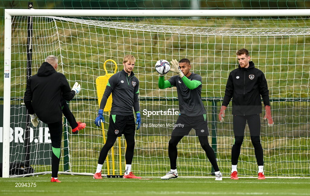 5 October 2021; Goalkeepers Gavin Bazunu, centre, with Caoimhin Kelleher, left, and Mark Travers and Goalkeeping coach Dean Kiely during a Republic of Ireland training session at the FAI National Training Centre in Abbotstown in Dublin. Photo by Stephen McCarthy/Sportsfile