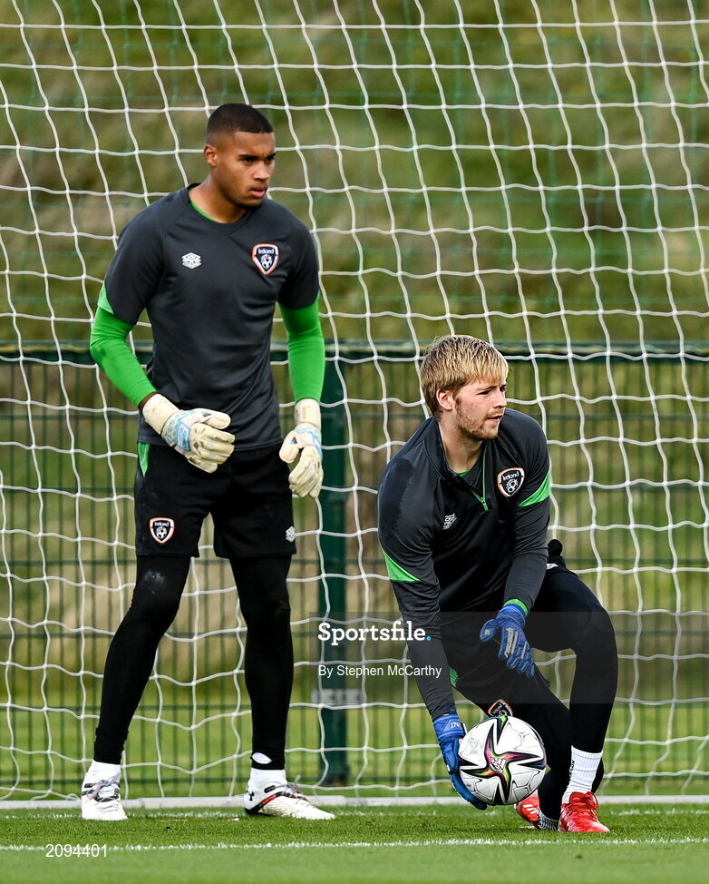 5 October 2021; Goalkeeper Caoimhin Kelleher and Gavin Bazunu, left, during a Republic of Ireland training session at the FAI National Training Centre in Abbotstown in Dublin. Photo by Stephen McCarthy/Sportsfile