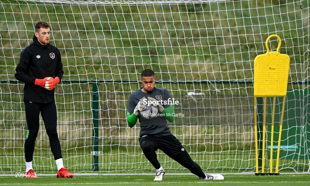 5 October 2021; Goalkeeper Gavin Bazunu and Mark Travers, left, during a Republic of Ireland training session at the FAI National Training Centre in Abbotstown in Dublin. Photo by Stephen McCarthy/Sportsfile