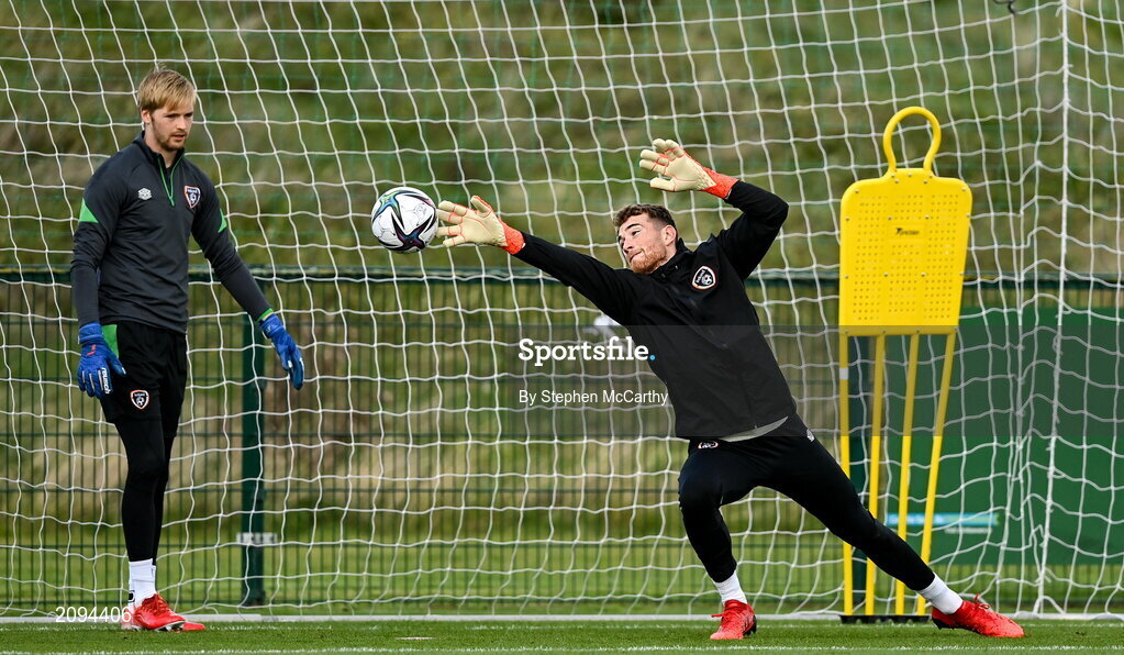 5 October 2021; Goalkeeper Mark Travers and Caoimhin Kelleher, left, during a Republic of Ireland training session at the FAI National Training Centre in Abbotstown in Dublin. Photo by Stephen McCarthy/Sportsfile