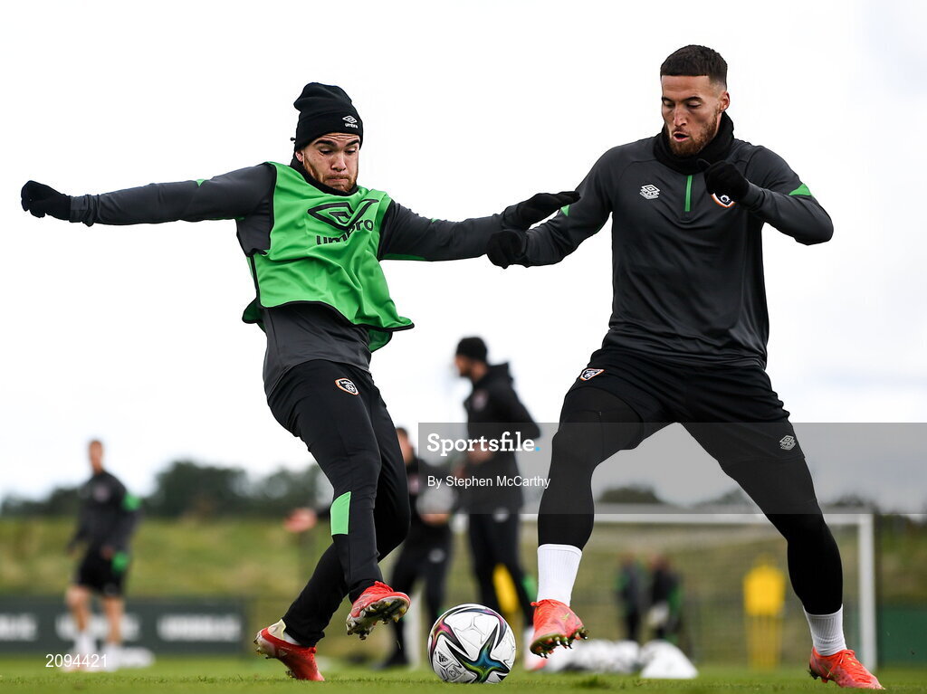 5 October 2021; Aaron Connolly, left, and Matt Doherty during a Republic of Ireland training session at the FAI National Training Centre in Abbotstown in Dublin. Photo by Stephen McCarthy/Sportsfile