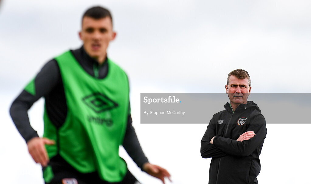 5 October 2021; Manager Stephen Kenny and Jason Knight, left, during a Republic of Ireland training session at the FAI National Training Centre in Abbotstown in Dublin. Photo by Stephen McCarthy/Sportsfile