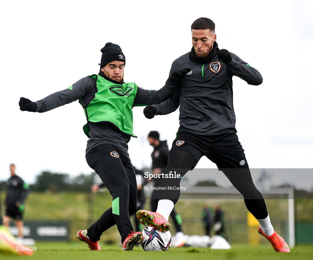 5 October 2021; Aaron Connolly, left, and Matt Doherty during a Republic of Ireland training session at the FAI National Training Centre in Abbotstown in Dublin. Photo by Stephen McCarthy/Sportsfile