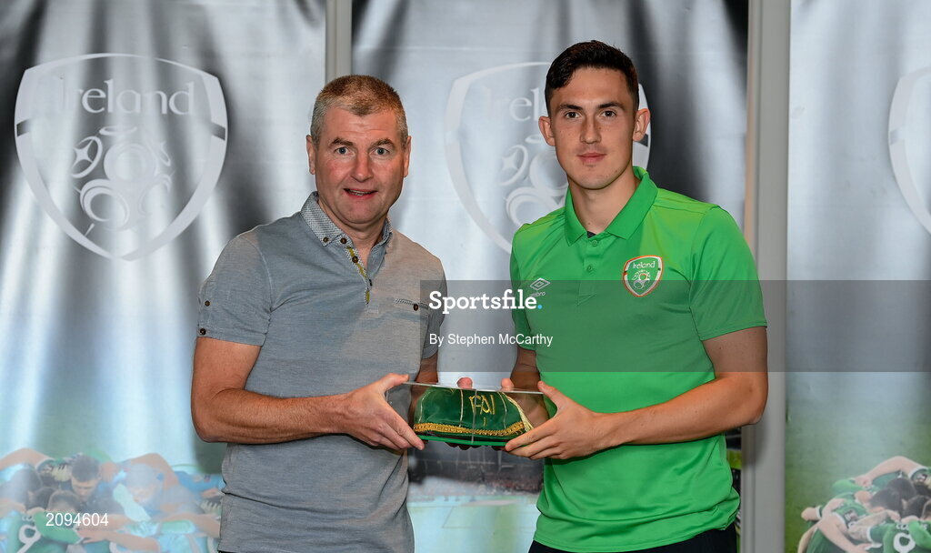 6 October 2021; Jamie McGrath is presented with his 2020-2021 Republic of Ireland international cap by former Republic of Ireland player Denis Irwin during a presentation at their team hotel in Dublin. Photo by Stephen McCarthy/Sportsfile