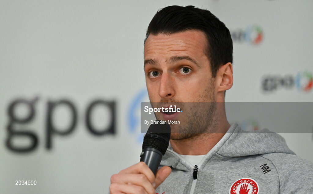 7 October 2021; GPA national executive committee member and Tyrone footballer Niall Morgan speaking at a GPA Media Conference at the Crowne Plaza Hotel in Santry, Dublin, to address the upcoming GAA inter-county football championship structure proposals. Photo by Brendan Moran/Sportsfile