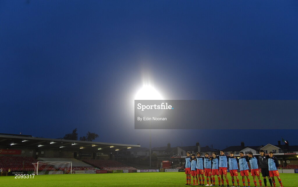 7 October 2021; Andorra players during the playing of their National Anthem before the UEFA U17 Championship Qualifier match between Republic of Ireland and Andorra at Turner's Cross in Cork. Photo by Eóin Noonan/Sportsfile