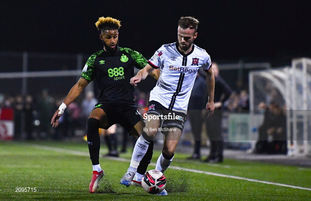 8 October 2021; Cameron Dummigan of Dundalk in action against Barry Cotter of Shamrock Rovers during the SSE Airtricity League Premier Division match between Dundalk and Shamrock Rovers at Oriel Park in Dundalk, Louth. Photo by Ben McShane/Sportsfile