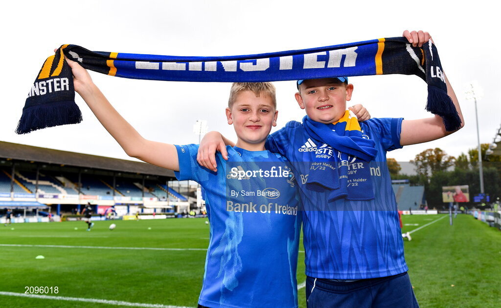 9 October 2021; Leinster supporters and twin brothers Aaron, left, and Sean Clarke, both aged 11, from Wicklow town before the United Rugby Championship match between Leinster and Zebre at RDS Arena in Dublin. Photo by Sam Barnes/Sportsfile
