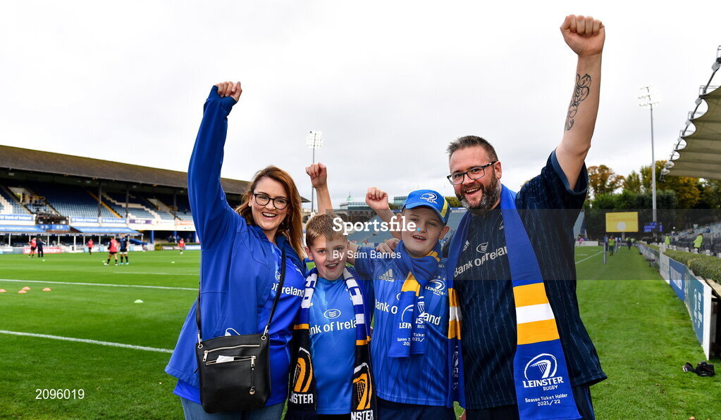 9 October 2021; Leinster supporters Stacey and Anthony Clarke, with their twin sons Aaron, left, and Sean, both aged 11, from Wicklow town before the United Rugby Championship match between Leinster and Zebre at RDS Arena in Dublin. Photo by Sam Barnes/Sportsfile
