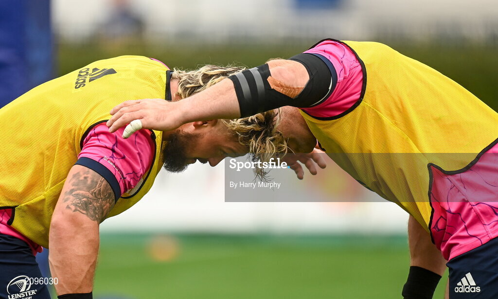 9 October 2021; Andrew Porter, left, and Cian Healy of Leinster warm up before the United Rugby Championship match between Leinster and Zebre at the RDS Arena in Dublin. Photo by Harry Murphy/Sportsfile