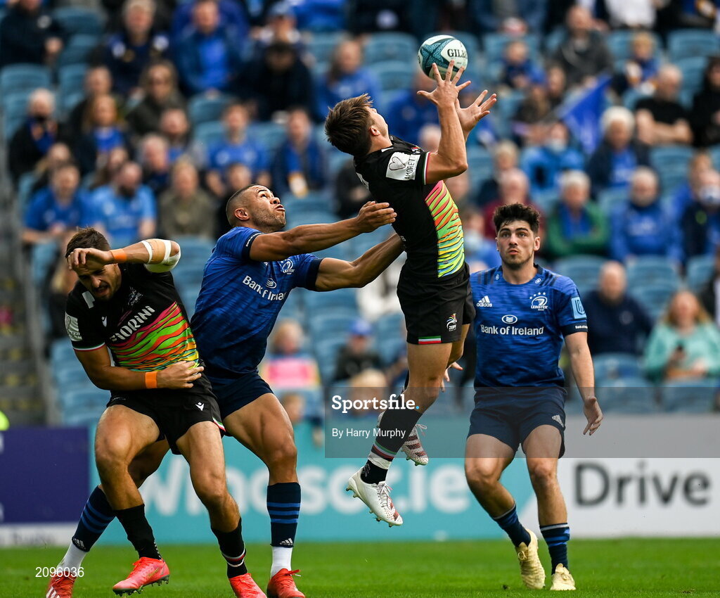9 October 2021; Antonio Rizzi of Zebre in action against Adam Byrne of Leinster during the United Rugby Championship match between Leinster and Zebre at the RDS Arena in Dublin. Photo by Harry Murphy/Sportsfile