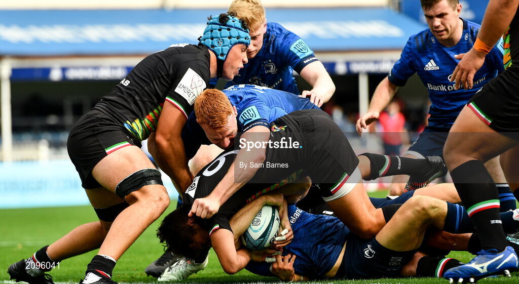 9 October 2021; Jordan Larmour of Leinster, hidden, scores his side's second try despite the efforts the Zebre defense during the United Rugby Championship match between Leinster and Zebre at RDS Arena in Dublin. Photo by Sam Barnes/Sportsfile