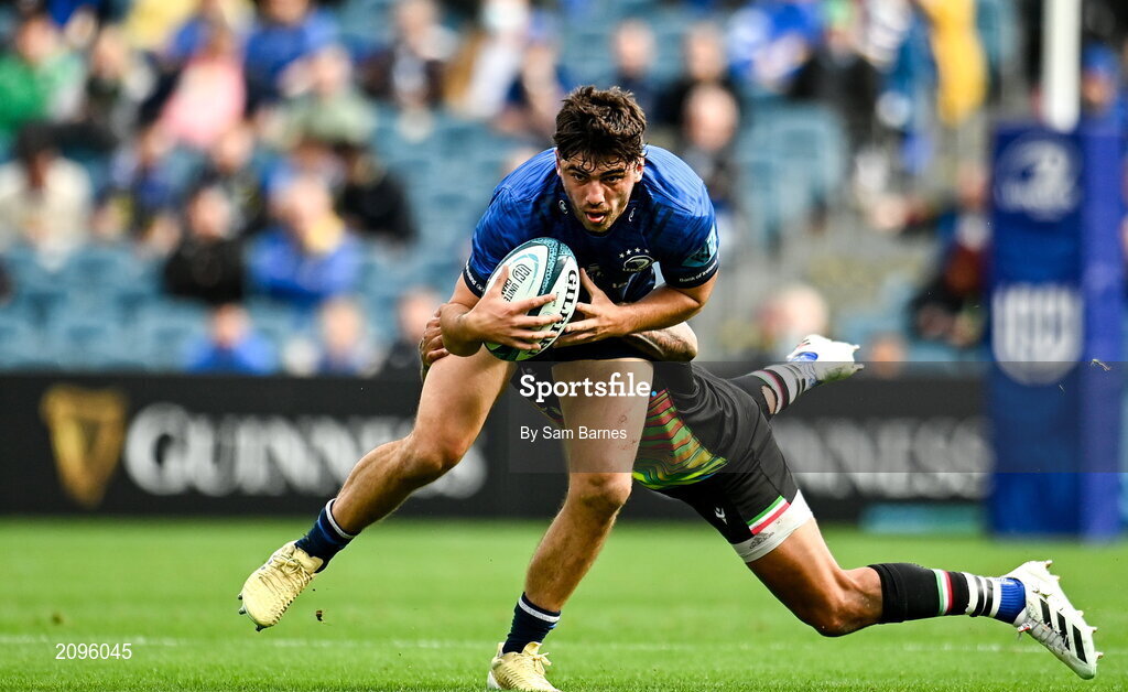 9 October 2021; Jimmy O'Brien of Leinster is tackled by Pierre Bruno of Zebre during the United Rugby Championship match between Leinster and Zebre at RDS Arena in Dublin. Photo by Sam Barnes/Sportsfile
