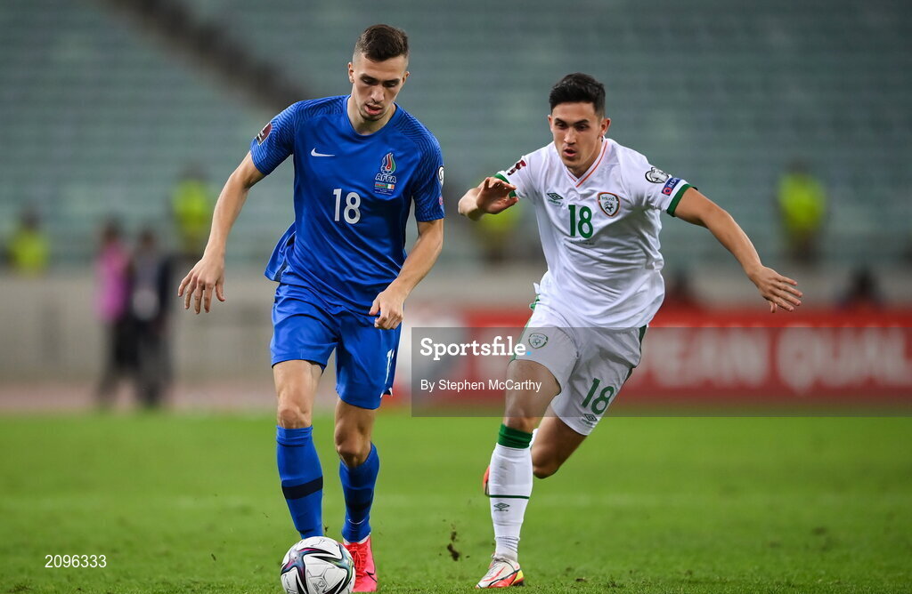 9 October 2021; Anton Krivotsyuk of Azerbaijan in action against Jamie McGrath of Republic of Ireland during the FIFA World Cup 2022 qualifying group A match between Azerbaijan and Republic of Ireland at the Olympic Stadium in Baku, Azerbaijan. Photo by Stephen McCarthy/Sportsfile