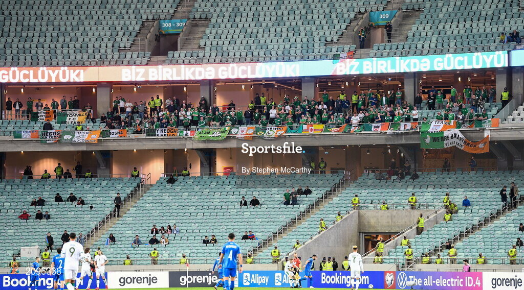 9 October 2021; Republic of Ireland supporters during the FIFA World Cup 2022 qualifying group A match between Azerbaijan and Republic of Ireland at the Olympic Stadium in Baku, Azerbaijan. Photo by Stephen McCarthy/Sportsfile
