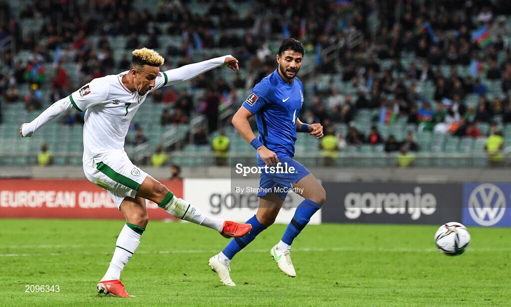 9 October 2021; Callum Robinson of Republic of Ireland has a shot on goal during the FIFA World Cup 2022 qualifying group A match between Azerbaijan and Republic of Ireland at the Olympic Stadium in Baku, Azerbaijan. Photo by Stephen McCarthy/Sportsfile