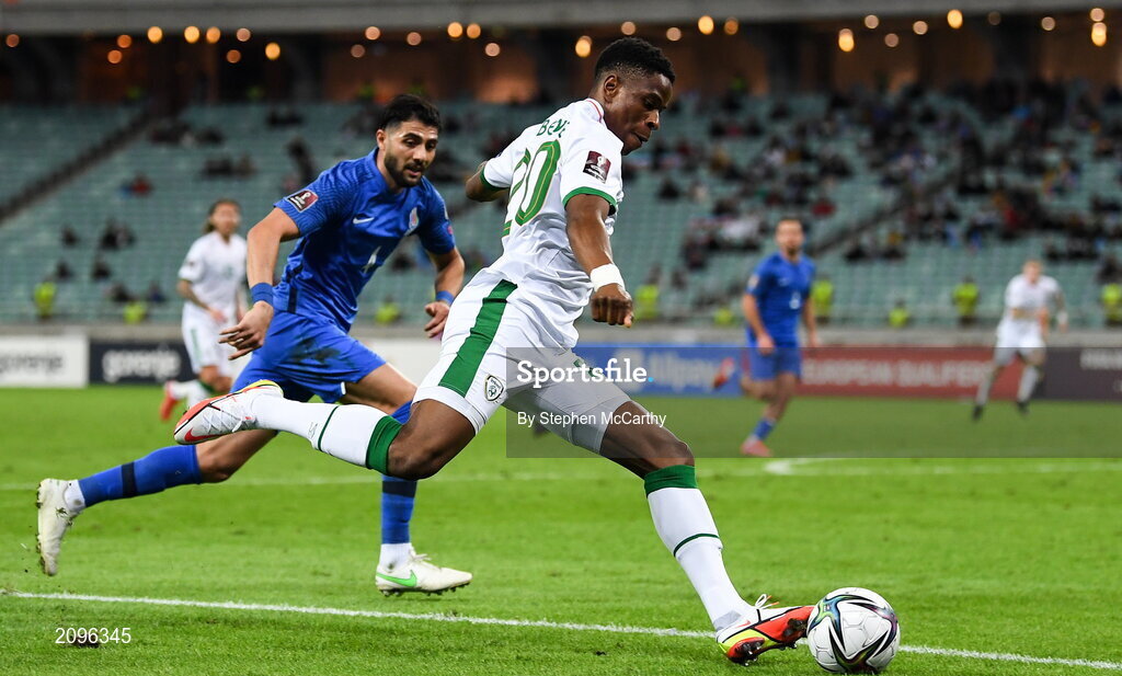 9 October 2021; Chiedozie Ogbene of Republic of Ireland in action against Hojjat Haghverdi of Azerbaijan during the FIFA World Cup 2022 qualifying group A match between Azerbaijan and Republic of Ireland at the Olympic Stadium in Baku, Azerbaijan. Photo by Stephen McCarthy/Sportsfile