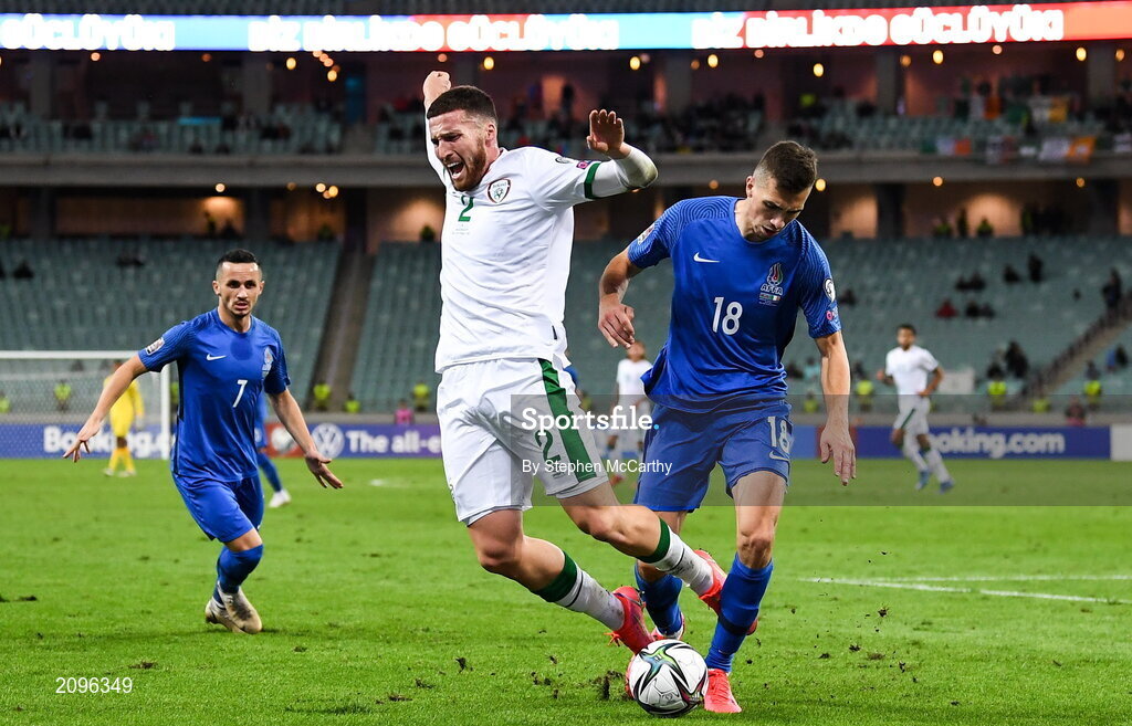 9 October 2021; Matt Doherty of Republic of Ireland in action against Anton Krivotsyuk of Azerbaijan during the FIFA World Cup 2022 qualifying group A match between Azerbaijan and Republic of Ireland at the Olympic Stadium in Baku, Azerbaijan. Photo by Stephen McCarthy/Sportsfile