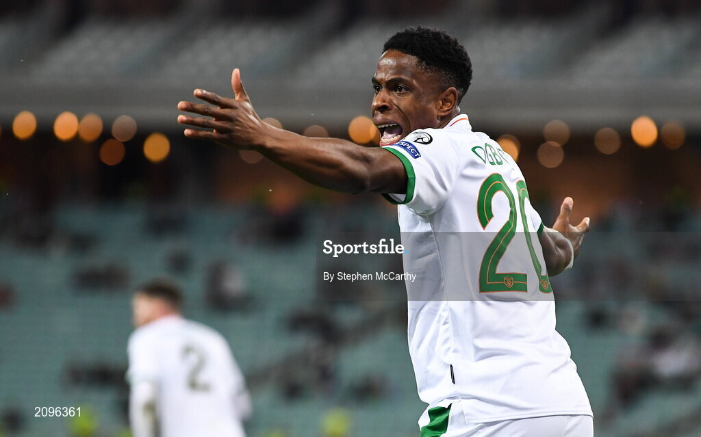 9 October 2021; Chiedozie Ogbene of Republic of Ireland reacts during the FIFA World Cup 2022 qualifying group A match between Azerbaijan and Republic of Ireland at the Olympic Stadium in Baku, Azerbaijan. Photo by Stephen McCarthy/Sportsfile