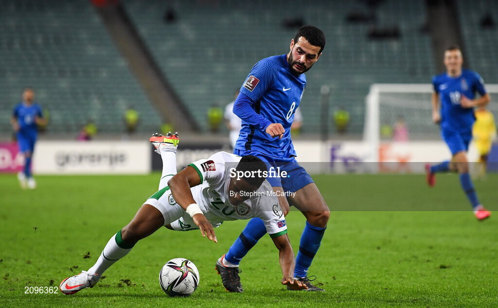 9 October 2021; Chiedozie Ogbene of Republic of Ireland in action against Emin Makhmudov of Azerbaijan during the FIFA World Cup 2022 qualifying group A match between Azerbaijan and Republic of Ireland at the Olympic Stadium in Baku, Azerbaijan. Photo by Stephen McCarthy/Sportsfile