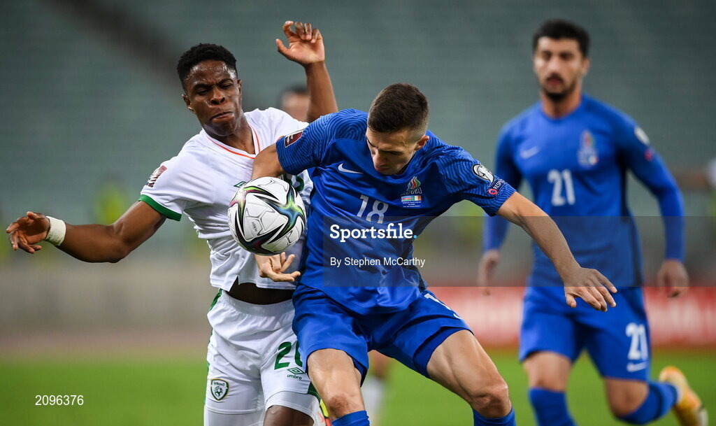 9 October 2021; Anton Krivotsyuk of Azerbaijan in action against Chiedozie Ogbene of Republic of Ireland during the FIFA World Cup 2022 qualifying group A match between Azerbaijan and Republic of Ireland at the Olympic Stadium in Baku, Azerbaijan. Photo by Stephen McCarthy/Sportsfile
