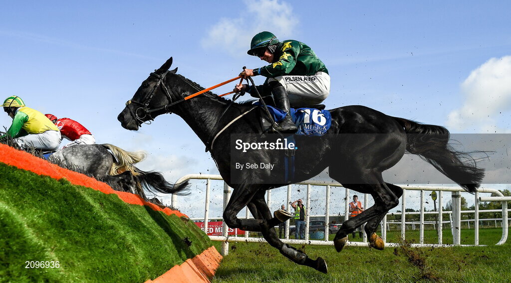 10 October 2021; Stumptown, with Conor McNamara up, jumps the last on their way to winning the PricewaterhouseCoopers Maiden Hurdle at Limerick Racecourse in Patrickswell, Limerick. Photo by Seb Daly/Sportsfile