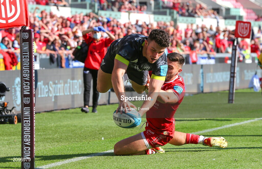 10 October 2021; Calvin Nash of Munster dives in to score try during the United Rugby Championship match between Scarlets and Munster at Parc Y Scarlets in Llanelli, Wales. Photo by Gareth Everett/Sportsfile