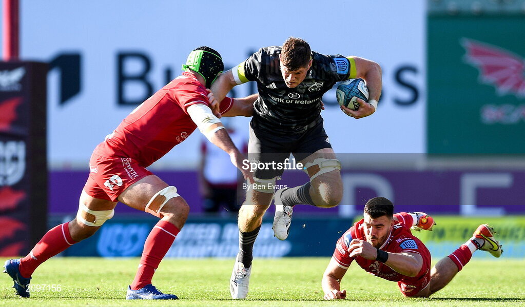 10 October 2021; Jack O’Donoghue of Munster evades the tackles of Morgan Jones and Johnny Williams of Scarlets during the United Rugby Championship match between Scarlets and Munster at Parc Y Scarlets in Llanelli, Wales. Photo by Ben Evans/Sportsfile