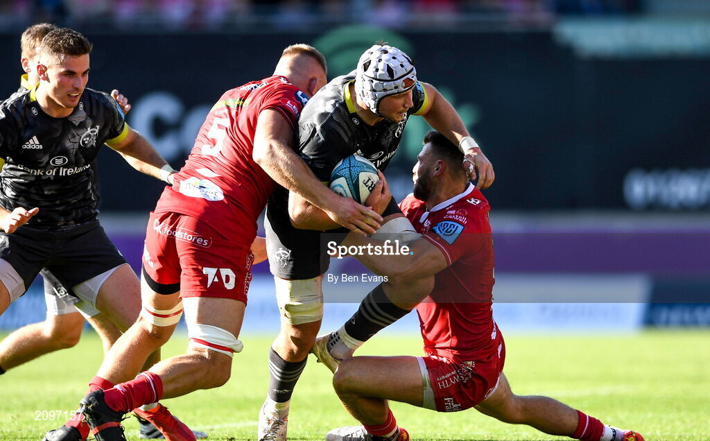 10 October 2021; Fineen Wycherley of Munster is tackled by Johnny Williams and Lloyd Ashley of Scarlets during the United Rugby Championship match between Scarlets and Munster at Parc Y Scarlets in Llanelli, Wales. Photo by Ben Evans/Sportsfile