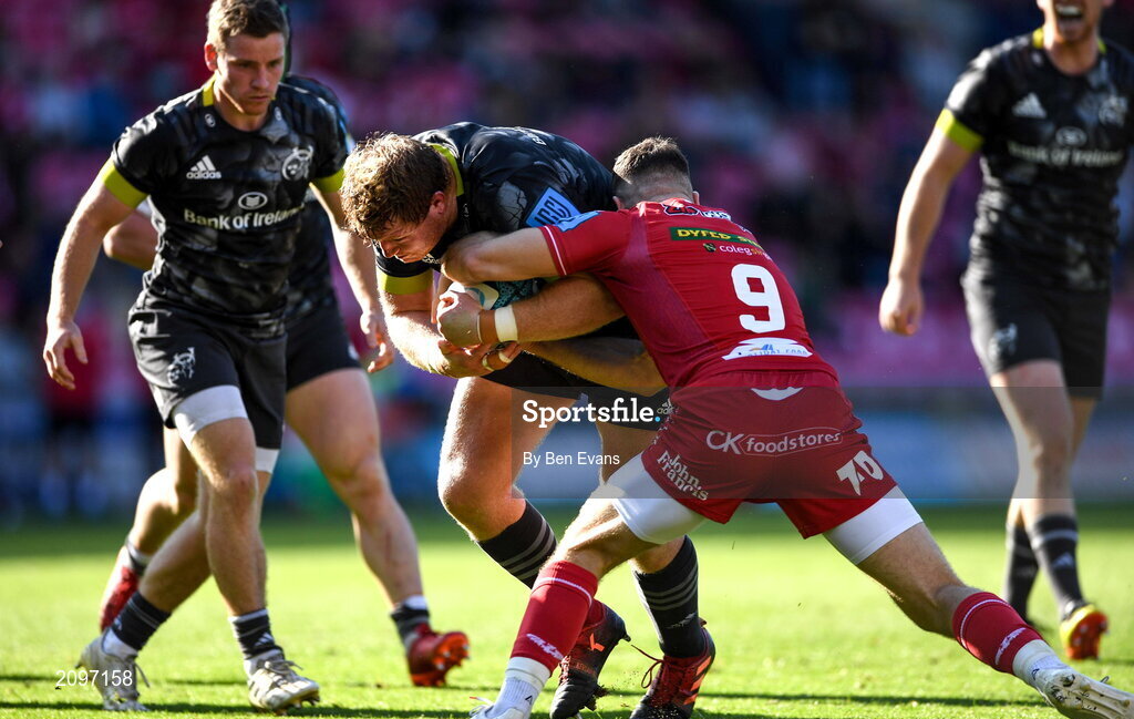 10 October 2021; Stephen Archer of Munster is tackled by Gareth Davies of Scarlets during the United Rugby Championship match between Scarlets and Munster at Parc Y Scarlets in Llanelli, Wales. Photo by Ben Evans/Sportsfile