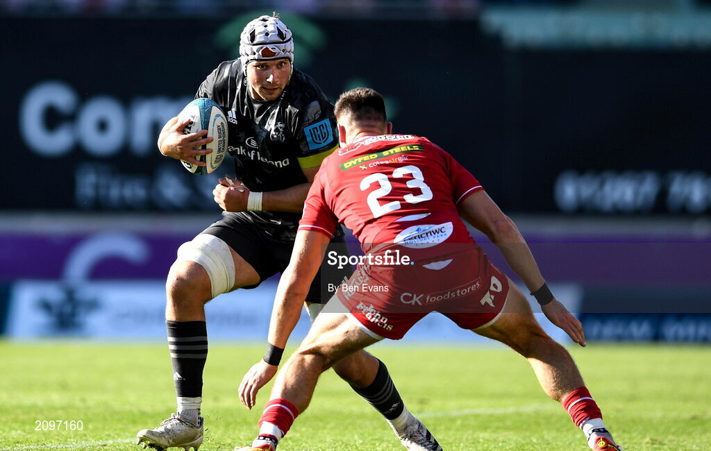 10 October 2021; Fineen Wycherley of Munster in action against Johnny Williams of Scarlets during the United Rugby Championship match between Scarlets and Munster at Parc Y Scarlets in Llanelli, Wales. Photo by Ben Evans/Sportsfile