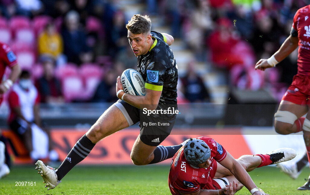 10 October 2021; Liam Coombes of Munster on his way to scoring his side's second try during the United Rugby Championship match between Scarlets and Munster at Parc Y Scarlets in Llanelli, Wales. Photo by Ben Evans/Sportsfile