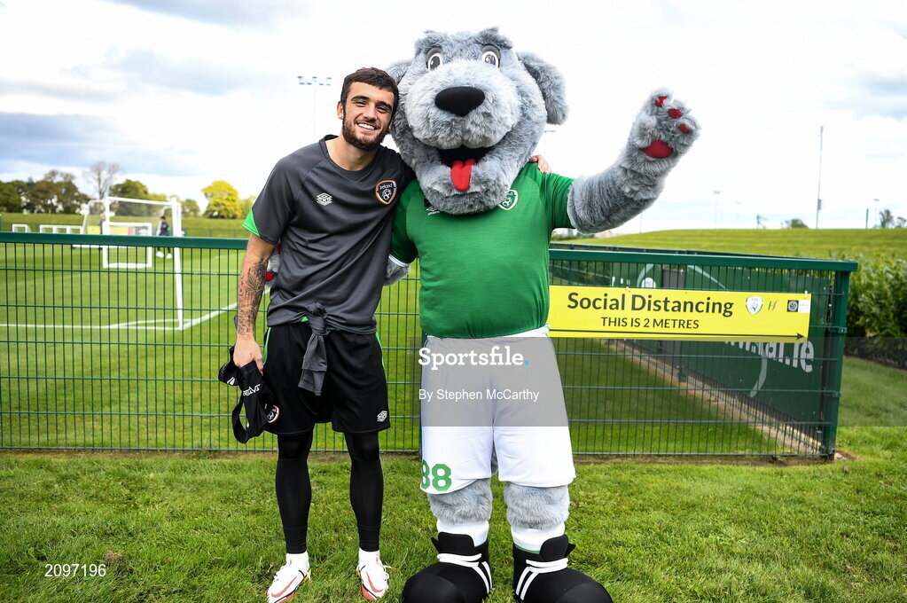 10 October 2021; Macúl the official FAI mascot for all supporters in partnership with the Confederation of Republic of Ireland Supporters Clubs at a Republic of Ireland training session in Abbotstown, Dublin, with Troy Parrott. Photo by Stephen McCarthy/Sportsfile