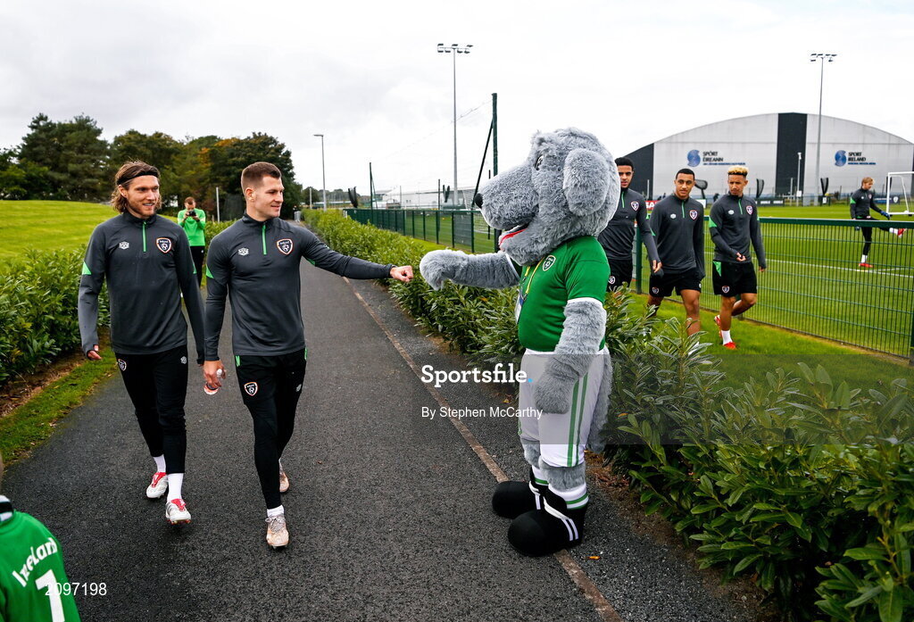 10 October 2021; Macúl the official FAI mascot for all supporters in partnership with the Confederation of Republic of Ireland Supporters Clubs at a Republic of Ireland training session in Abbotstown, Dublin, with James Collins, centre, and Jeff Hendrick. Photo by Stephen McCarthy/Sportsfile