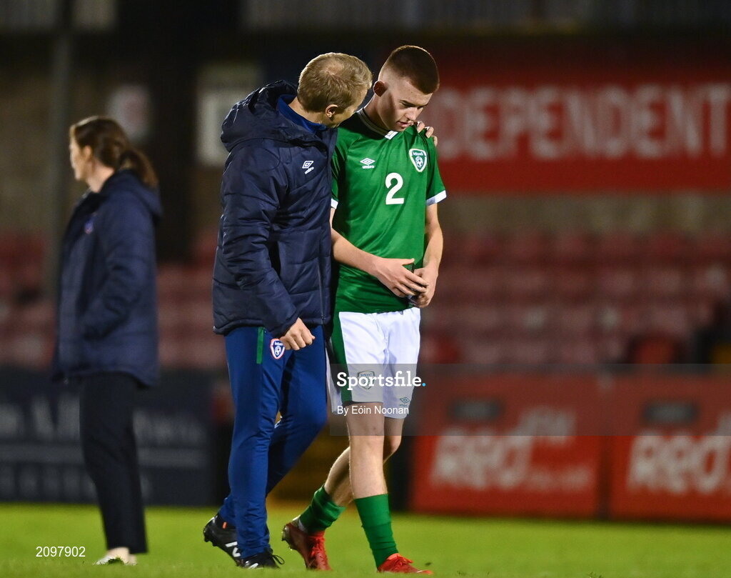10 October 2021; Republic of Ireland manager Colin O'Brien with Luke Browne of Republic of Ireland after the UEFA U17 Championship Qualifying Round Group 5 match between Republic of Ireland and North Macedonia at Turner's Cross in Cork. Photo by Eóin Noonan/Sportsfile