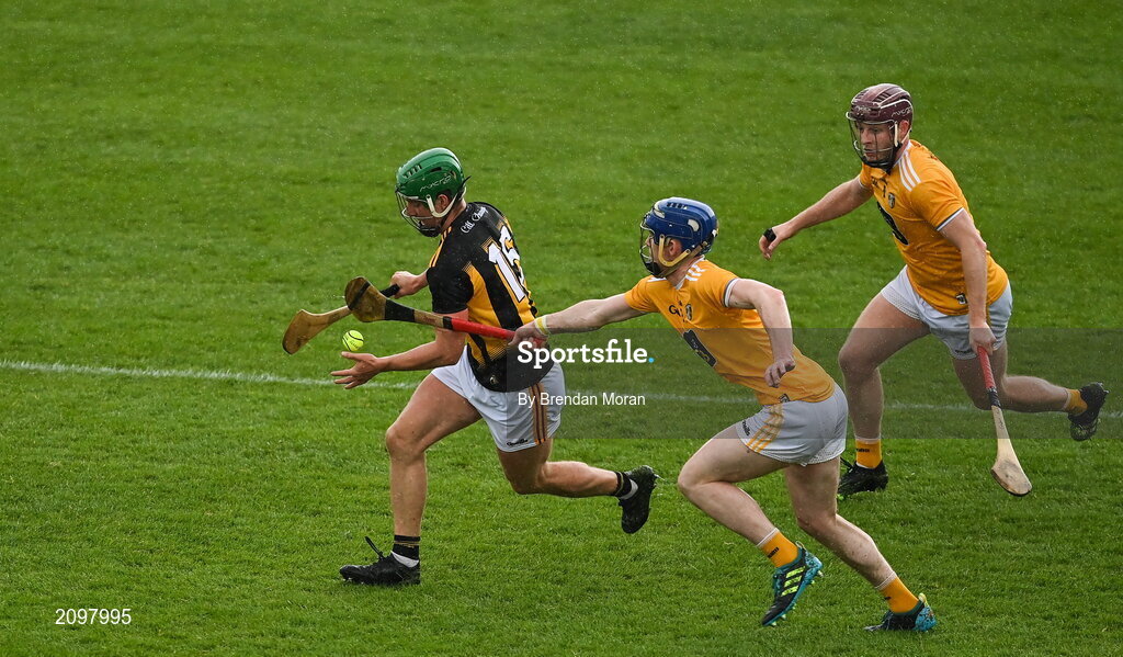 16 May 2021; Alan Murphy of Kilkenny in action against Damon McMullan and Eoghan Campbell of Antrim during the Allianz Hurling League Division 1 Group B Round 2 match between Kilkenny and Antrim at UPMC Nowlan Park in Kilkenny. Photo by Brendan Moran/Sportsfile