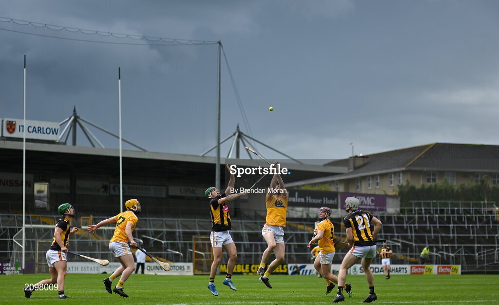 16 May 2021; Eoin Cody of Kilkenny and Gerard Walsh of Antrim contest a dropping ball during the Allianz Hurling League Division 1 Group B Round 2 match between Kilkenny and Antrim at UPMC Nowlan Park in Kilkenny. Photo by Brendan Moran/Sportsfile