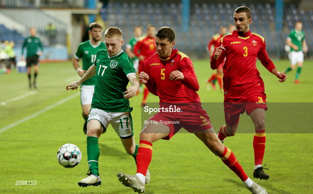 12 October 2021; Ross Tierney of Republic of Ireland in action against Anto Babic of Montenegro during the UEFA European U21 Championship Qualifier Group F match between Montenegro and Republic of Ireland at Gradski Stadion Podgorica in Podgorica, Montenegro. Photo by Filip Roganovic/Sportsfile