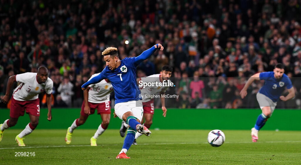 12 October 2021; Callum Robinson of Republic of Ireland shoots to score his side's second goal from a penalty during the international friendly match between Republic of Ireland and Qatar at Aviva Stadium in Dublin. Photo by Stephen McCarthy/Sportsfile