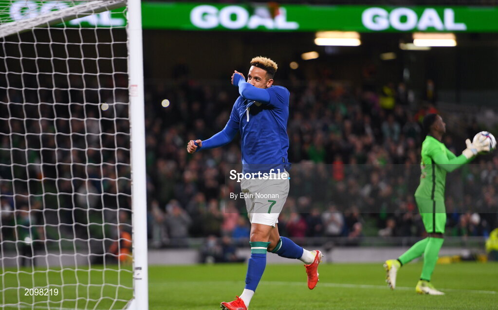 12 October 2021; Callum Robinson of Republic of Ireland celebrates after scoring his side's second goal during the international friendly match between Republic of Ireland and Qatar at Aviva Stadium in Dublin. Photo by Eóin Noonan/Sportsfile