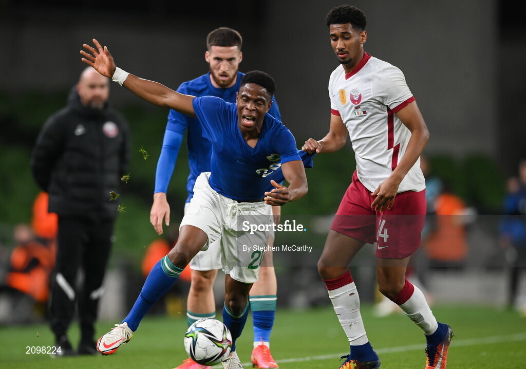 12 October 2021; Chiedozie Ogbene of Republic of Ireland is tackled by Homam Elamin of Qatar during the international friendly match between Republic of Ireland and Qatar at Aviva Stadium in Dublin. Photo by Stephen McCarthy/Sportsfile