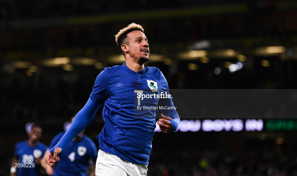 12 October 2021; Callum Robinson of Republic of Ireland celebrates after scoring his side's first goal during the international friendly match between Republic of Ireland and Qatar at Aviva Stadium in Dublin. Photo by Stephen McCarthy/Sportsfile