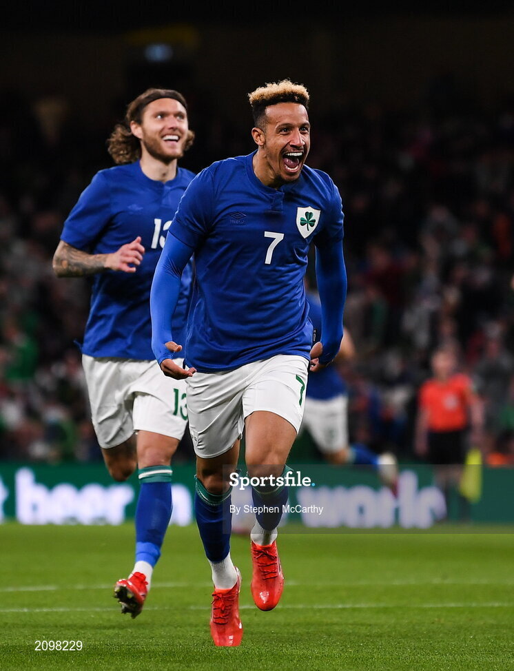 12 October 2021; Callum Robinson of Republic of Ireland celebrates after scoring his side's first goal during the international friendly match between Republic of Ireland and Qatar at Aviva Stadium in Dublin. Photo by Stephen McCarthy/Sportsfile