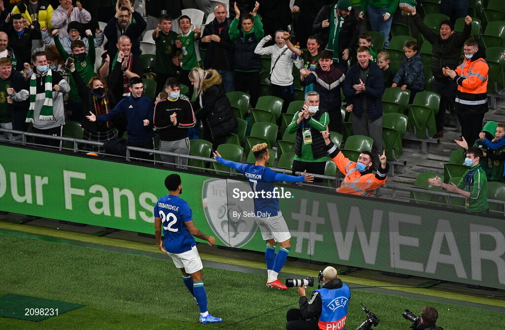 12 October 2021; Callum Robinson of Republic of Ireland celebrates with supporters after scoring their side's first goal during the international friendly match between Republic of Ireland and Qatar at Aviva Stadium in Dublin. Photo by Seb Daly/Sportsfile