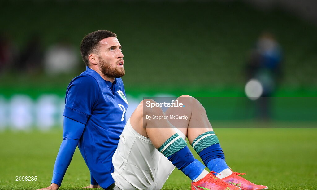 12 October 2021; Matt Doherty of Republic of Ireland before leaving the pitch with an injury during the international friendly match between Republic of Ireland and Qatar at Aviva Stadium in Dublin. Photo by Stephen McCarthy/Sportsfile